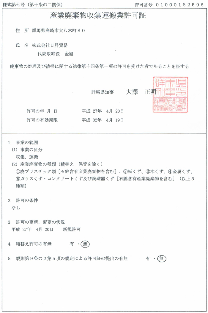 | 2015年4月 | 廃プラスチック買取業、産業廃棄物収集運搬業開始 |